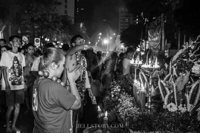เราไปถึงประมาณ 1 ทุ่มเห็นจะได้ ก็ได้ยินเสียง ….โอม..กาลี…โอม….. อันเป็นเสียงบูชาพระแม่กาลีดังเป็นระยะๆ มีการตั้งโต๊ะหมู่บูชา แถวเริ่มต้นตั้งแต่ตรงสี่แยกถนนสีลมก่อนถึงวัดแขก ยาวไปรอบๆถึงฝั่งสถานทูตพม่า มีโต๊ะหมู่บูชาที่ประดับประดาไปด้วยข้าวตอกดอกไม้ ผลไม้ธูปเทียน รวมไปถึงเครื่องหอมที่พอได้กลิ่นก็แสนจะรัญจวนใจ และจะมีผู้นำอยู่ในแต่ละโต๊ะบูชา เรียงรายกันไปทำให้เห็นถึงความยิ่งใหญ่อลังการของพิธีนี้..