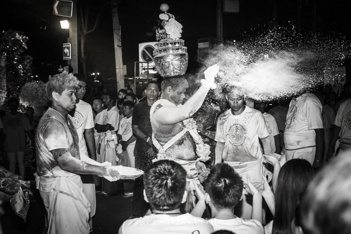 ร่างทรงจะทูนหัวด้วย “หม้อกลัศ” หรือ “กลาฮัม” ซึ่งมีน้ำหนักมากกว่าสิบกิโลกรัม พร้อมกับเดินรำและโปรยสีชาดพร้อมกับผงธูป ผงแก่นจันทร์ เอาไว้ให้แก่ผู้ที่ศรัทธาเพื่อความเป็นสิริมงคล