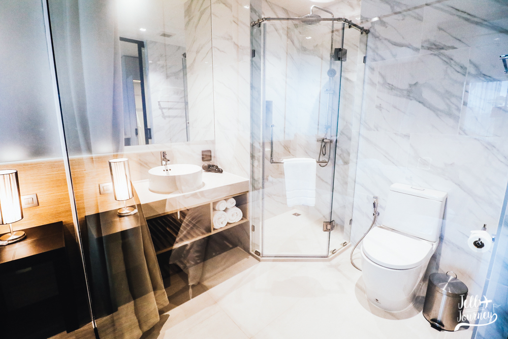 ในส่วนของห้องน้ำนั้น เจลชอบมาก เพราะว่าเป็นห้องน้ำตกแต่งด้วยหินอ่อนทั้งห้อง และมีกระจกเปิดโล่ง แต่ไม่ต้องกลัวถ้าหากเรามาพักกับเพื่อน เขาก็จะมีผ้าม่านสำหรับปิดกั้นไว้เป็นส่วนตัว ห้องน้ำใหญ่ๆมีไดร์เป่าผม อ่างล้างหน้า พร้อมแยกส่วนแห้งกับส่วนเปียกชัดเจนเลย