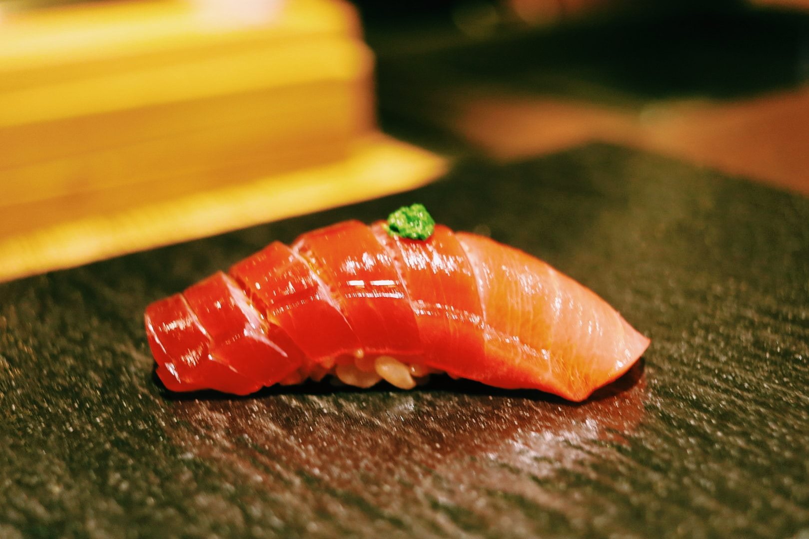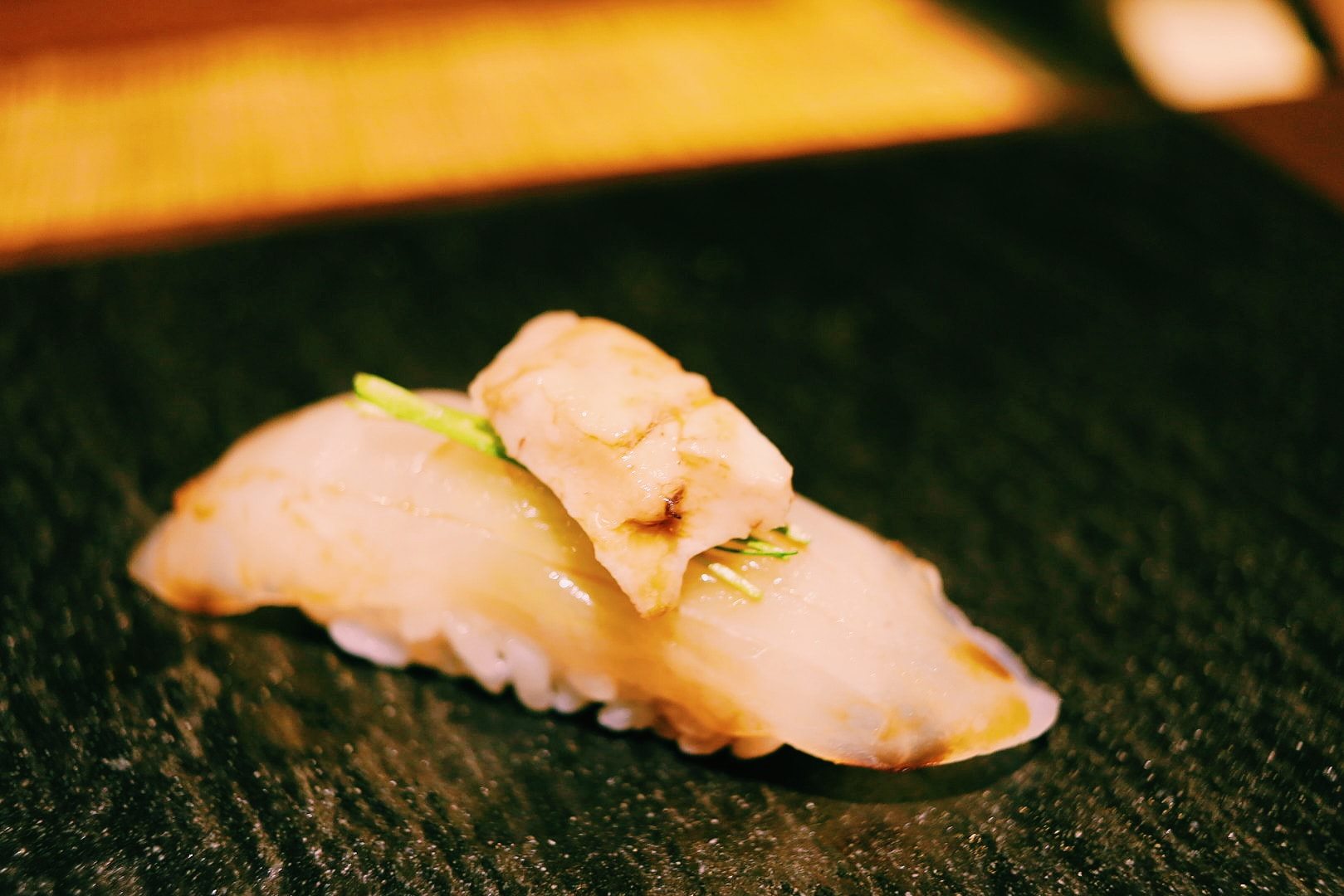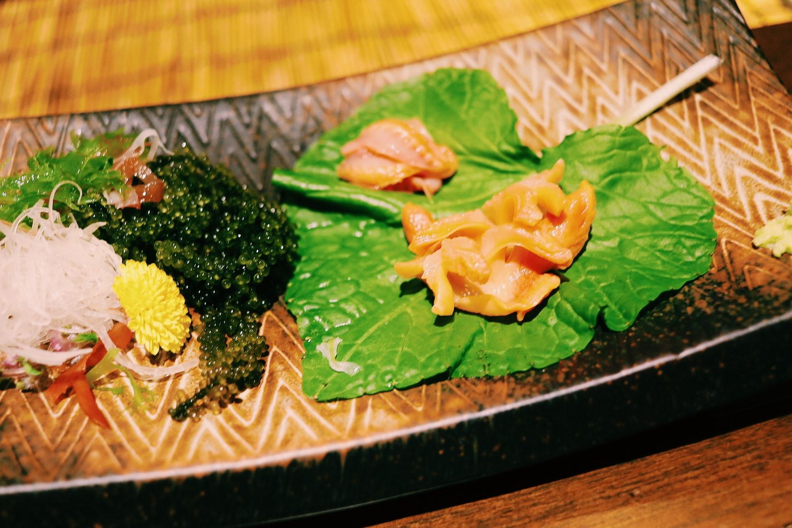 เมนูที่เด็ดมากๆ ไม่ว่าจะเป็น ไข่หอยเม่น, Chutoro ซูชิจากปลา Hon Mugura ที่ส่งตรงมาจากเมือง Chiba ผ่านการบ่มหรือ aging ปั้นพร้อมด้วยข้าวที่หุงด้วยน้ำส้มสายชูแดงซึ่งมีรสเข้มข้นมากและช่วยตัดรสมันจากชิ้นเนื้อปลาได้ดี, กุ้งหวานที่ถูกคัดสรรมาแบบสดๆ, Ankimo ส่วนตับของปลาอังโกะ วัตุดิบพิเศษที่เรียกว่าเป็นฟัวกราส์แห่งท้องทะเล นึ่งและหมักด้วยซอส พอลิ้มรสแล้วคือแทบจะละลายในปากเลยทีเดียวค่ะ, ปลาเนื้อขาวที่ถูกปรุงผสมกับซอสสูตรเฉพาะ จับคู่กับท็อปปิ้งอย่างเลม่อนญี่ปุ่น เพิ่มรสชาติให้มีความอมเปรี้ยวนิดๆ ดึงความสมบูรณ์ของซูชิคำนั้นให้น่าอร่อยมากขึ้น รวมไปถึงอีกหลากหลายเมนูที่แตกต่างกันไปในแต่ละวัน